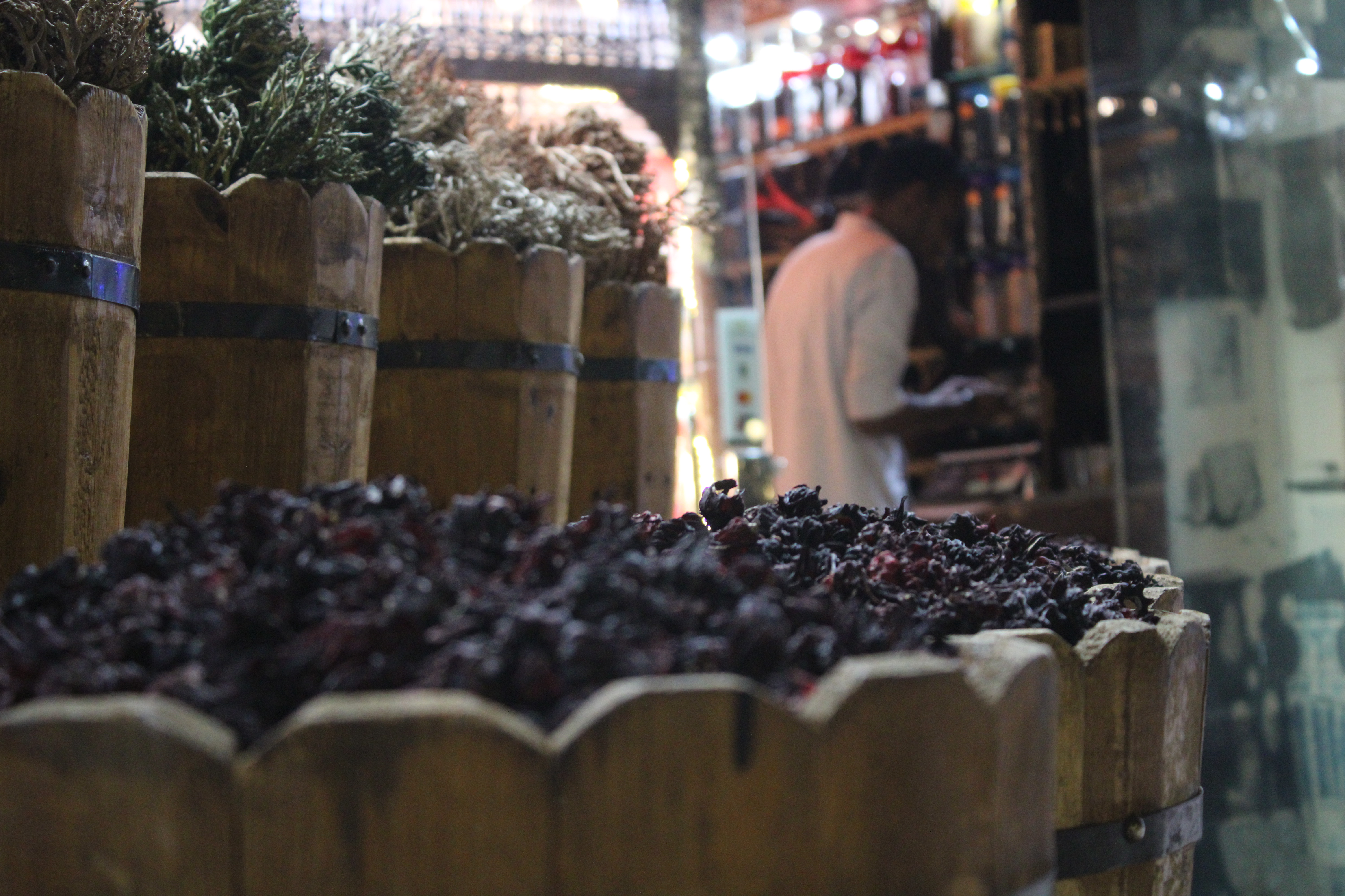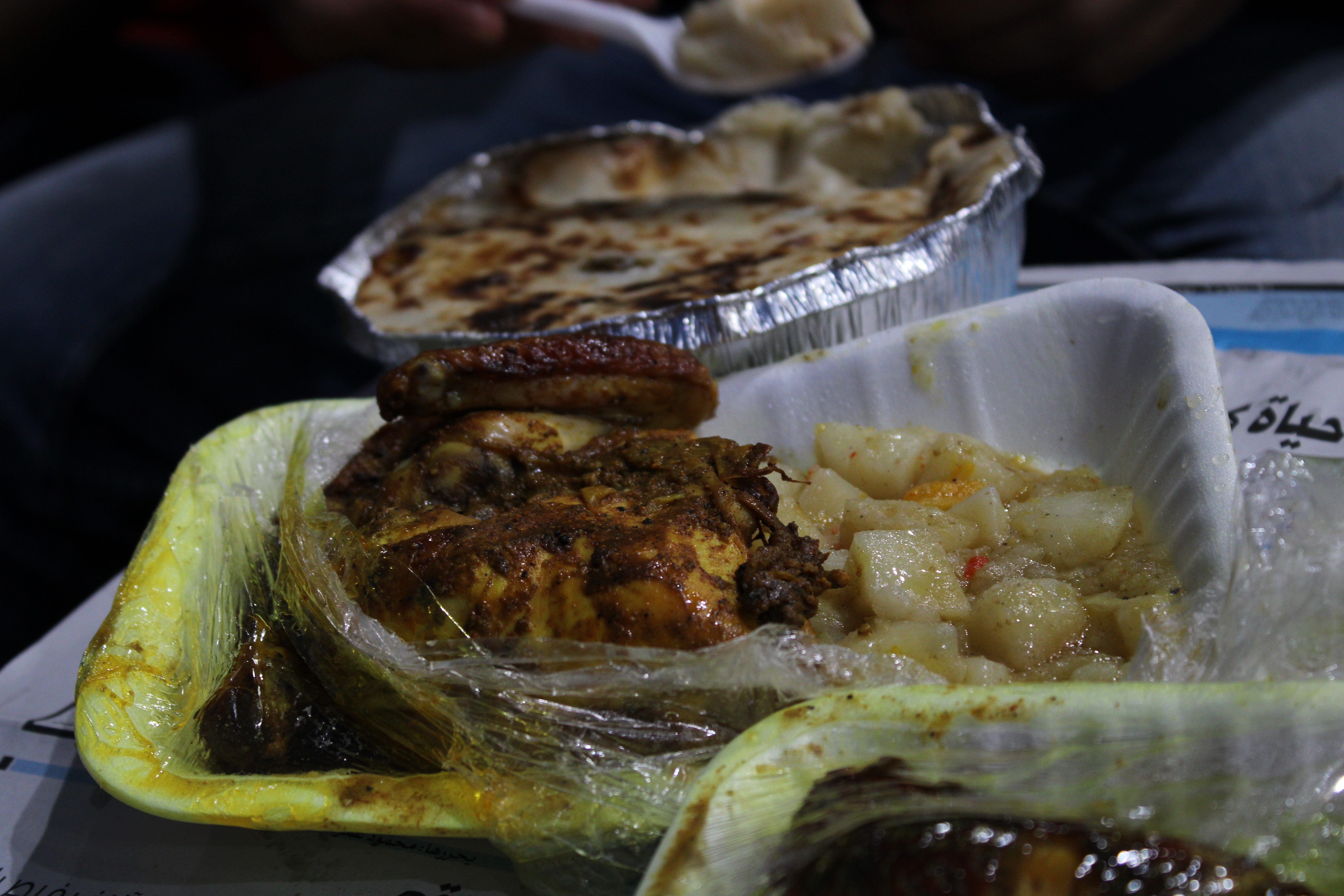 Après avoir partagé l’eau, nous mangeons des dattes sèches puis le repas arrive en taxis. Des tables sont installées dehors. Je suis invitée à m’asseoir confortablement sur un fauteuil, en face d’Ibrahim et de l’amoncellement d’épices derrière lui. Me voilà à casser le jeûne avec une joyeuse bande d’hommes musulmans, moi la femme occidentale, non voilée, de culture catholique. Je me confonds en shukran*. Le propriétaire de la boutique me dit nonchalamment en pointant mon bras : « c’est normal. Nous avons le même sang. Nous faisons partie de la même famille. Tu es comme une sœur pour nous ». Tandis que je me remplis l’estomac, le cœur et l’esprit de ce moment, Félix, un des jeunes vendeurs, qui aime s’écrier « mon chéri vache kiri » à tous les francophones qu’il croise, m’explique que tous les soirs, une de leurs amies prépare le repas de l’iftar, « made with love ». Une fois les panses lourdes, on se lave les mains, la bouche et le visage. Mes camarades vont prier à l’intérieur du magasin puis réinstallent les tapis, les tables : la journée de travail se termine à 23 h.
